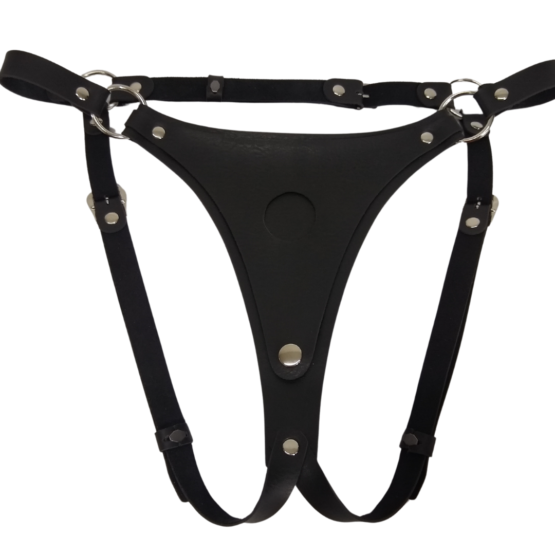 Cinta Peniana com uma camada a mais para proteção da pele, fixada com botão de pressão. Regulável na cintura/bumbum. Com furo de 42mm