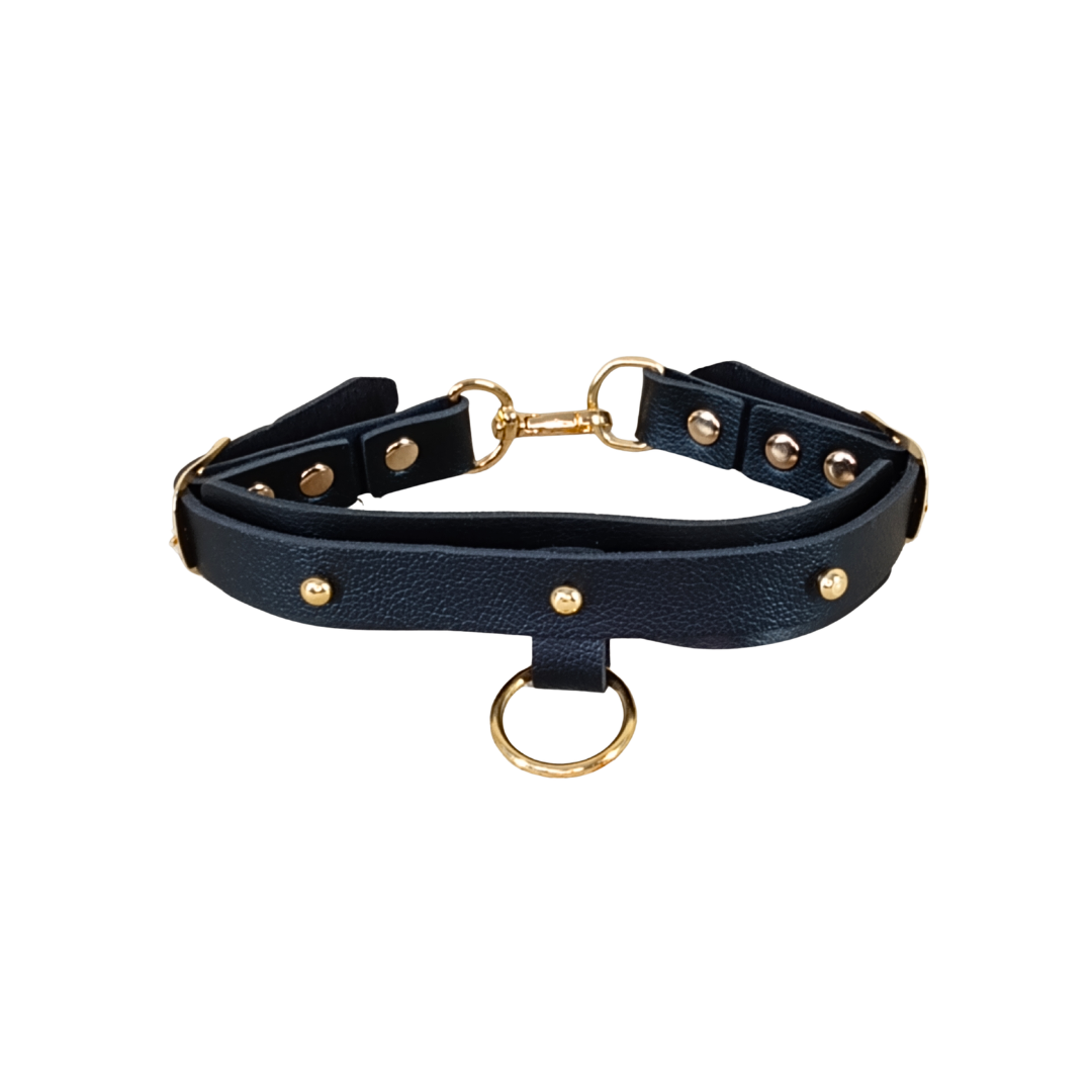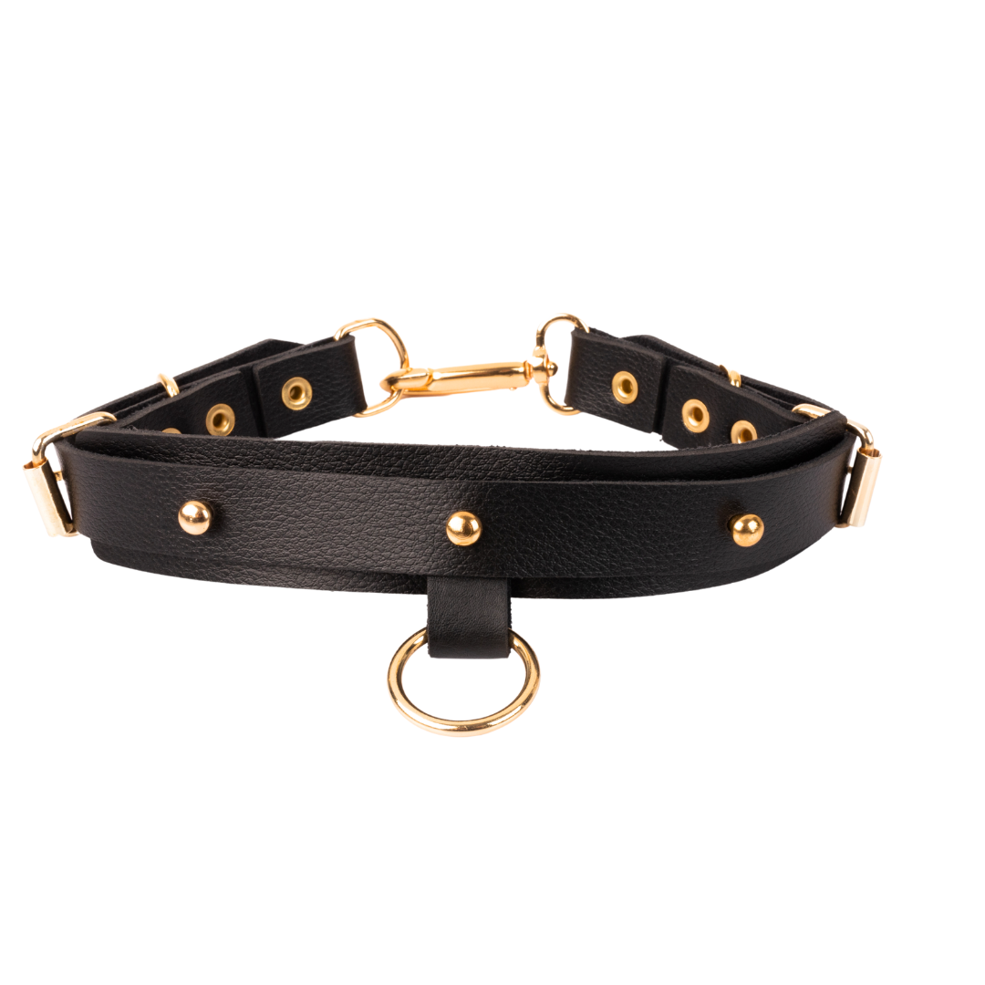 O modelo Gargantilha Argola Gold é uma coleira confeccionada em material Montana de grande resistência, revestimento interno macio e confortável, tiras duplas e delicada argola no centro da peça.