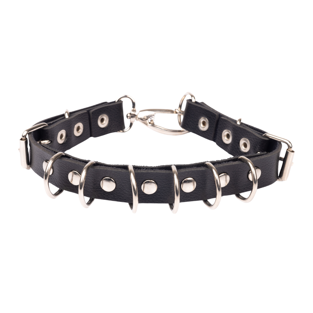O modelo Gargantilha Charmosa é uma coleira social com design exclusivo e sofisticado. Este modelo possui meia argolas de metal niquelado e arrebites em toda sua extensão, proporcionando um visual de grande apelo fetichista.