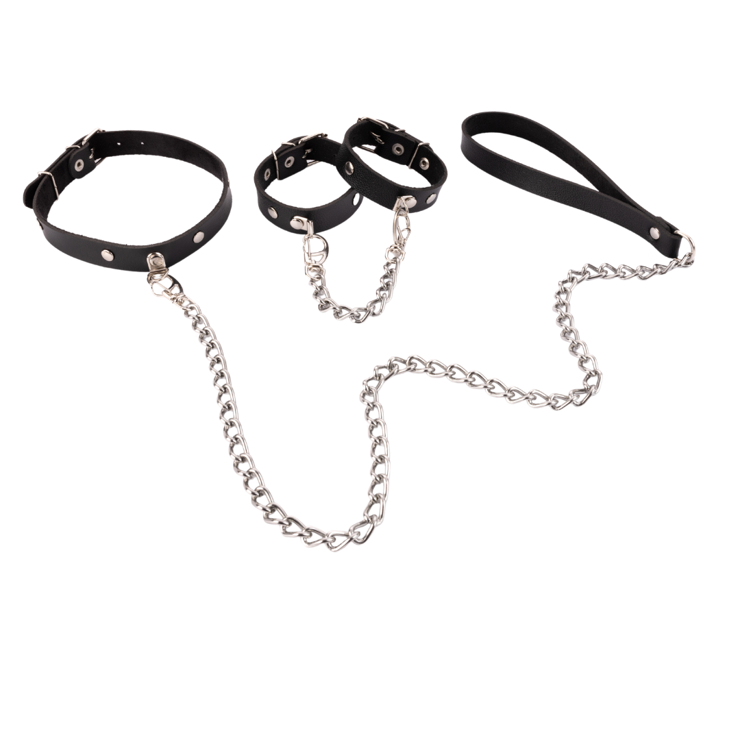 O revestimento interno da gargantilha e bracelete é macio e muito confortável para uso. São peças com fivelas ajustáveis conforme suas medidas. A coleira e algema são interligadas por uma guia de corrente niquelada.