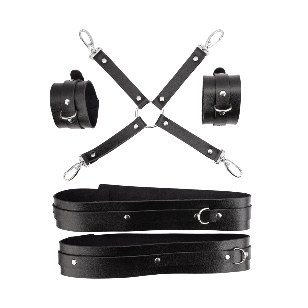 Este kit é composto por dois braceletes para pulso e duas algemas para coxas interligadas por uma peça em formato de X, proporcionando um visual de altíssimo apelo erótico.