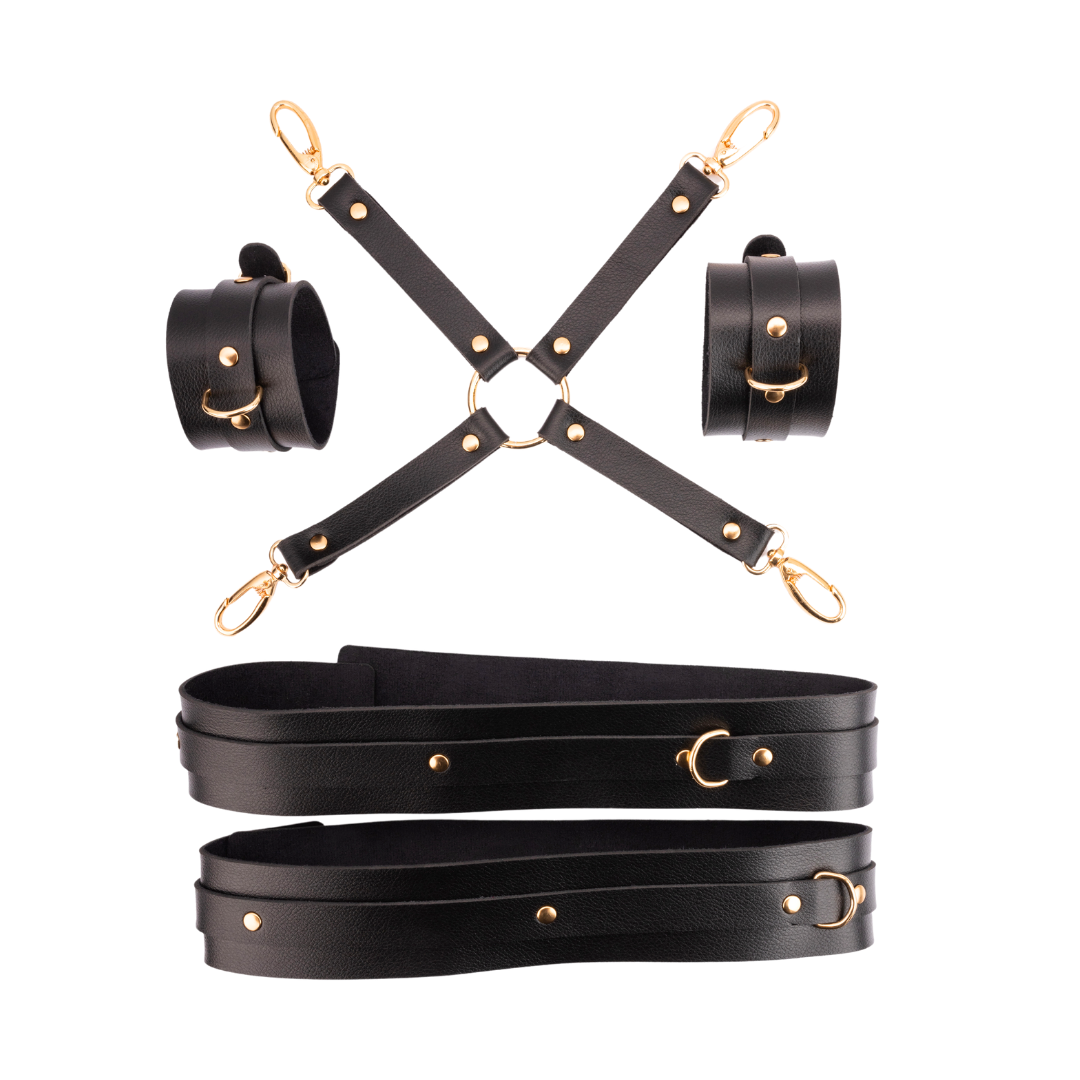 Este kit é composto por dois braceletes para pulso e duas algemas para coxas interligadas por uma peça em formato de X, proporcionando um visual de altíssimo apelo erótico.